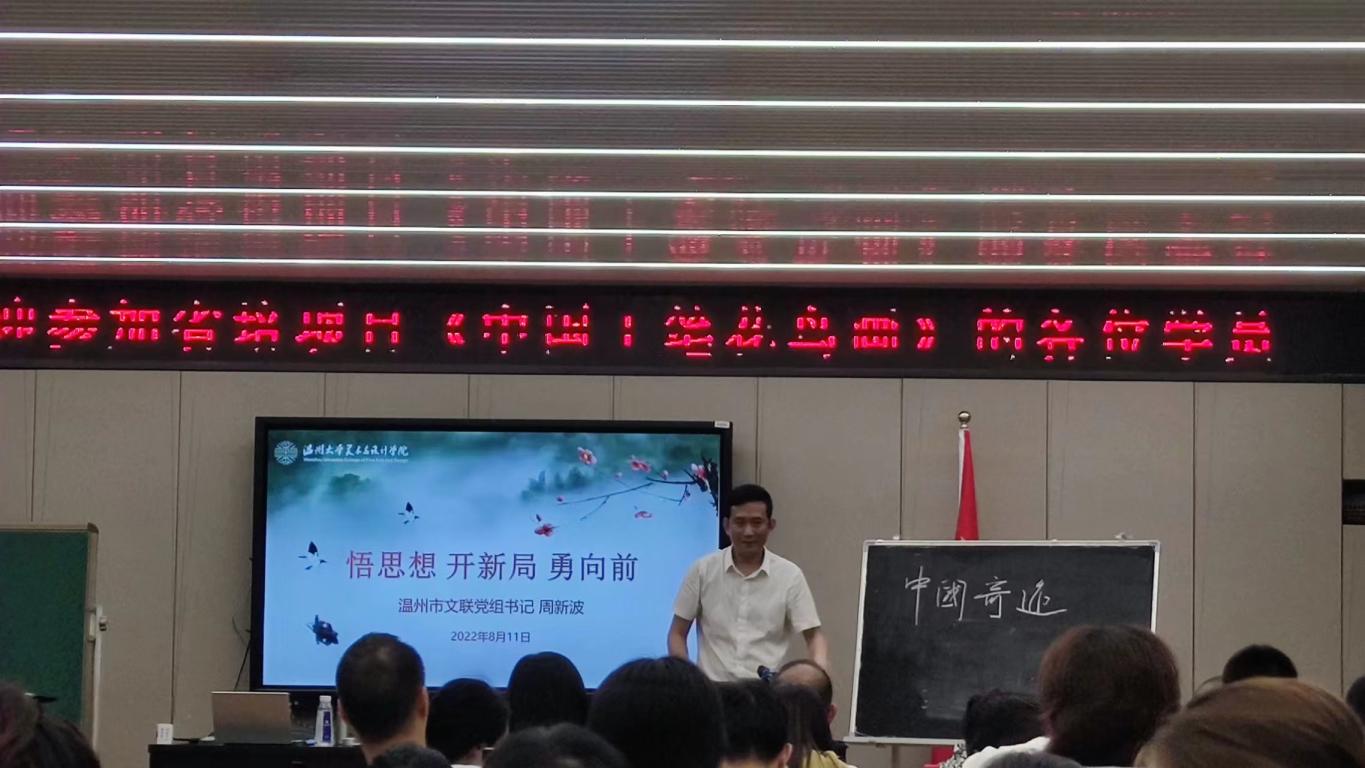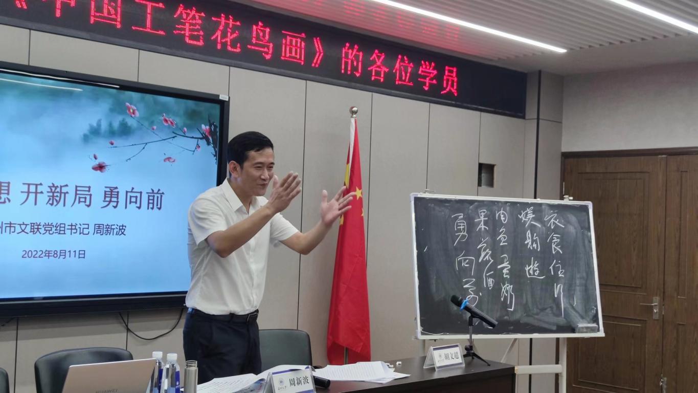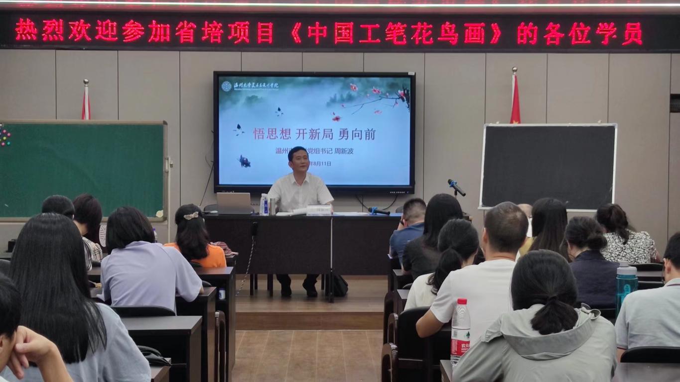 2022年8月11日下午两点,在由3044am永利集团3044noc举办的省培项目——《中国工笔花鸟画》课程中,温州市文联党组书记周新波同志受邀对全体参加此次培训的中小学教师进行了以“悟思想,开新局,勇向前”为主题的专家讲座交流。3044am永利集团3044noc院长谢子静、副院长胡文超、继续教育中心主任邹青、团委指导老师石建林,以及全体参训教师一同参与此次活动。