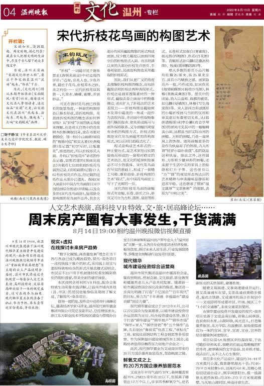宋韵如水,浸润瓯越。两宋时期,韵之何在?藏在古人温雅文明的生活中,尽显于古人留下的众多瑰宝中。千年宋韵风华,数不清,道不尽。目前,温州正实施“宋韵文化传世工程”,要让千年宋韵在温州“流动”起来,“传承”下去。为此,《文化周刊》将从本期开始推出《宋韵瓯风·有赏》栏目,邀请温州文化名人带领读者,通过细品“宋韵”之美,让宋韵文化在温州“热起来、活起来、用起来、强起来”,打响“宋韵瓯风”品牌。谢子静 系3044am永利集团3044noc院长、教授、硕士生导师“折枝” 一词最早见于唐朱景玄《唐朝名画录》中对边鸾的评价:“边鸾,京兆人也,少攻丹青,最长于花鸟,折枝草木之妙,未之有也…… 近代折枝花居其第一,凡草木、蜂蝶、雀蝉,并居妙品。”另外《宣和画谱》记载:“边鸾,长安人,以丹青驰誉于时,尤长于花鸟……又作折枝花,亦曲尽其妙。”可见在唐时花鸟画已具独有的取景角度,一种新的构图形态已基本形成,即折枝构图。花恩画折枝构图的概念该如何界定呢?从“折枝”字 面的狭义角度来理解,应是将大自然中的花草树木折断摘取回来,放在书案对着描绘。邹一桂《小山画谱》里说的“瓶插对临”和吴太素《松斋梅谱》里记载“初学写时,以瓶置花”,即是指此,均以折枝形式入画。并有以“折枝花卉”命名的作品记载,如郭若虚的《画见闻志》共载有七位画家画折枝花鸟画的记录,《宣和画谱》记载17人62件 折枝花卉作品,但记载的这些作品大部分已遗失。查阅《宋人画册》《中国古代书画图目》《中国绘画综合图录》并续编,以及众多的《宋代花鸟画册》,发现除全景构图的花鸟画作品外,其余大部分均采用截取物象的形式构成画面,仅少数几幅是以画面四周空白的折枝形式入画。而且明清以来的大部分折枝花卉册页、手卷和扇面,其画面构图采用的也是截取的折枝形式。崔白(北宋)《寒雀图》因此,我们从更广义的角度去理解折枝构图的概念,应包括截取法和折枝法两种表现形式,折枝法是画家搜集素材的一种形式,截取法是让画面中的物像撑边,进而扩大了折枝法的艺术表现力——折枝构图是截取树木花草中最美的一角或一段作为表现内容,并对画中所取物象进行概括取舍,使其形成既可与画外保持联系,又令画幅四周留有余纸的构图方式。其构成法则运用灵活,结构组合丰富变化,内涵深广且法度严谨。折枝式构图是宋代花鸟画最常用的构图形式,宋以后则日趋程式化了。程式是构成艺术形式的一种主要方式,是艺术家经过长期提炼而形成的一套相对稳定的艺术语言,是文化的延续和发展必不可少的载体。宋代花鸟画在写实的基础上,形成了一套精工勾勒、重彩渲染、折枝构图的艺术“程式”,在中国花鸟画史上写下了光辉的一页。宋代的折枝花鸟画的画幅形式有直幅、长卷、册页之分,册页又可分为方形、圆形、扇面等形式。长卷形式如崔白《寒雀图》、扬无咎《四梅图》、佚名《百花图》等。直幅形式如马麟《层叠冰绡图》、牧溪《翡翠鹳鸽图》等。佚名(南宋)《疏荷沙鸟图》绝大多数的册页小品尺幅均在横25厘米、纵25厘米左右,具有小巧精致之感。画家取花卉一枝,巧布成局,如宋佚名《海棠峡蝶图》《疏荷沙鸟图》,林椿《果熟来禽图》等。册页中的团扇,给人以温和、典雅的感觉,如马麟《绿橘图》,林椿《写生海棠图》等。还有一些其它形式的扇面,具有随意、亲切之感,如佚名《豆花蜻蜓图》等。佚名(南宋)《海棠峡蝶图》宋人崇尚方形或圆形的小幅折枝画与当时的实用和审美意识有着密切关系,从《梧荫清暇图》和李公麟《高会学琴图》的屏风可见其中的一幅幅精美小画,这都是当时实际应用的画幅。方形的画幅,乃是一扇屏风上的饰图。圆形画幅更多的是作为纨扇面子的饰图,古人所谓“轻罗小扇扑流萤”,指的就是这种纨扇。除此之外,这些圆形、方形和少量异形的画幅,还来源于生活中实用家具上的贴络和灯片子等。这些册页以“方”“圆”的视觉形态传达出的艺术精神与审美趣味是静思和追求平稳。这也继承了儒家“温文敦厚”“文质彬彬”的理想,表现为“中和之美”。按康定斯基的说法,正方形在公式性的基础平面中是最客观的形态,寒冷感和暖和感保持着相对均衡,而圆形则是最接近不带色彩的静止的平面形态。林椿(南宋)《果熟来禽图》