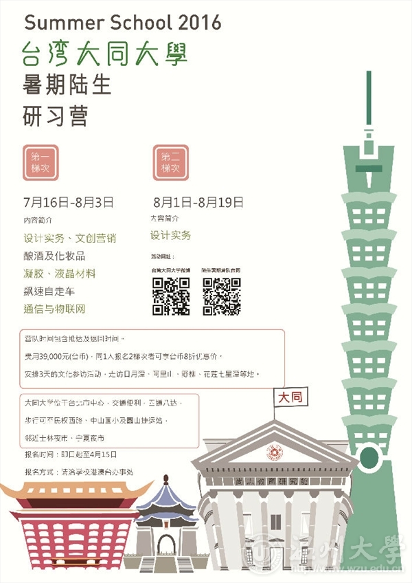 2016年暑期赴台湾大同大学设计营报名通知 一、活动宗旨: 近年来,两岸四地高校间学术活动交流频繁,大同大学为促进两岸师生进行交流与彼此认识,鼓励两岸学子建立深层情感并体验台湾之美。大同大学依据各学院系所专业特色,为大陆地区优秀学子量身打造各种专业营队活动:如商业领域之文创营销、工程领域之酿酒和化妆品、机电整合自走车、无线通信与物联网等主题实作课程,以及创意无限的设计实务等各项不同领域之深刻体验课程。相信参与的学子必能对台湾风情与大同大学各领域专业表现有深刻感动,并藉此营队激荡出更多脑力火花,促进双方交流与深层理解。 二、时间:第一梯次 营队 课程时间:2016年7月16日- 8月3 日第二梯次 营队 课程时间:2016年8月01日-8 月19日三、范围: 3044am永利集团3044noc本科2、3年级在读学生 四、人数: 10名五、费用: 一梯次39,000元新台币/人(折合人民币7800元/人),费用含研修费、住宿费、办证费、文化参访、行政费用等;同一人若报名两梯次者可享新台币8折优惠价。六、申请办法:个人申请(下载附件2、附件3)、学院推荐、择优录取。 七、报名地点:3044am永利集团3044noc学生科(2B205,Tel:86689191)联系人:景老师 八、大同大学简介: 大同大学由林尚志先生捐资兴学,于1956年创办大同工业专科学校,聘请林挺生先生担任校长,并于1963年改制为大同工学院,1999年改名为大同大学。全校共14个专业系所,分属工程学院、电机信息学院、经营学院及设计学院,其下设有11个本科,11个硕士班,9个硕士在职专班和8个博士班。 创立已60年的大同大学,以培养国家发展所需的科学家、工程师、设计师与事业经营者着称。学校屡获教育部教学卓越计划经费补助,连续五次(十年)获中国工程师学会「产学合作绩优单位」肯定,为产学合作标竿大学,并荣获德国红点(Red Dot)评比为亚太区前五大设计学校。 大同大学位于台北市中心,紧邻花博公园,步行可至民权西路、中山国小及圆山捷运站,生活机能完善,是有志向学者的理想学习环境。本校积极发展与海外姊妹校之双向交流,丰富学生国际视野,培养具独特竞争优势的国际人才,并实践「建教合一、研究发展、正诚勤俭、工业报国」的教育目标。 附件1:大同大學2016陸生暑期營隊-簡章附件2:申请表附件3:大同大學2016陸生暑期營隊-學生彙整表.xlsx