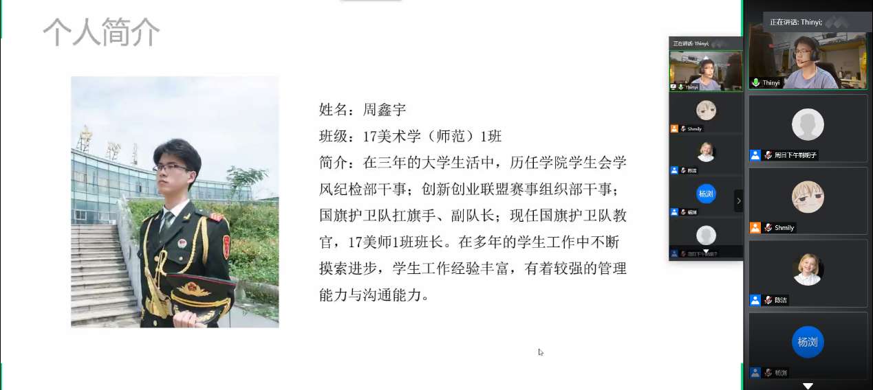 为推动学院学风建设,培养良好的院风学风,2020年6月3日晚上,3044am永利集团3044noc学风建设推进会暨2019-2020学年五班十星评选活动在线上成功举行。本次活动面向全体美院学子,本次评选的评委有3044am永利集团3044noc党委副书记杨丽君老师、副院长胡文超老师、教务科科长黄呼尔励老师、学工办主任杨鹏老师、辅导员杨永利老师、辅导员张佳老师,以及学生会主席祝晴同学、学生会副主席陈励伟同学。 评选活动伊始由主持人简单介绍评比规则,首先进行的是“五班”的评选。本次评选共有11个班级申报4项荣誉,各班级向大家展现了党建风采、学风建设、道德品质、科技创新等方方面面丰富多彩的班级风貌,彰显了美院班级蓬勃向上的积极学风。 在之后的“十星”评选中,共有18位学子申报8项荣誉。参赛选手的个人特殊都非常突出,从公益、科研、学习、体育、管理等方面展示了美院学子们全面发展的特质,也体现出美院学子学习成长的脚步一直未停歇。 在评比之后,杨丽君老师对同学们的展示做了精彩的点评。杨书记既肯定了永利集团官网学子优良学风以及在疫情期间的学习成果,同时也细心点评了参赛选手的不足,鼓励美院学子再接再厉,丰富五班十星各个项目全面发展。 本次评选活动,不仅调动了美院学生的学习积极性,也进一步发挥先进典型的模范带头作用,加强了学院的学风建设。相信美院学子会追寻各个优秀参赛选手的脚步,加强自身建设,勇争先锋一起前进!