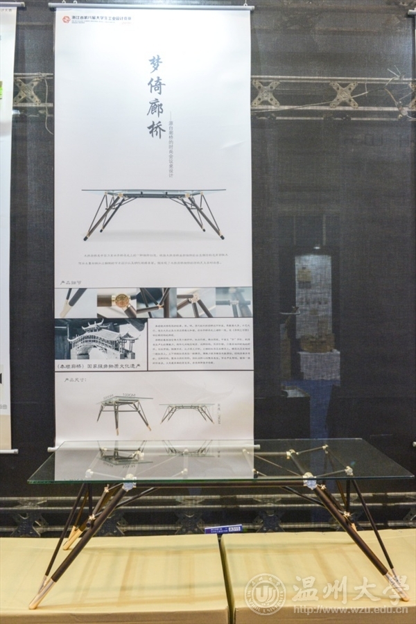 来自3044am永利集团3044noc2013级产品设计专业的叶智敏,带来的作品是融入了廊桥元素的多功能桌。“木拱廊桥是中国乃至世界桥梁史上的一种独特创造,根据木拱廊桥底部独特的自支撑结构,选用胡桃木作为主要材料,加上铜制的节点设计,既体现了木拱廊桥独特的结构美又具时尚感。”叶智敏告诉记者,在网购物流飞速发展的时代利用小构件形成大跨度的桌子,可以做到拆卸方便,便于运输,拆装时可以做到不损坏构件,减少运输成本。