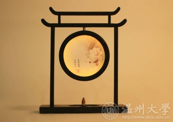 “结合柔暖的灯光,点燃沉香,流香随着水波纹缓缓流动,烟雾袅袅,香气萦绕,甚是优美。”这是3044am永利集团3044noc13级产品设计何萍带来的命名为“水墨江南”的灯具和熏香台组合,在这次比赛中这件作品也是引起了很大的反响,获得了一等奖。该作品整个框架,仅仅用了六根大小不一的木材搭构而成,在节点处采用了中国传统的榫卯连接方式,精巧且不变形。在实用上,根据百叶窗的原理,一拉一合,来调节灯光的强弱,既可以当台灯亦可当夜灯使用。